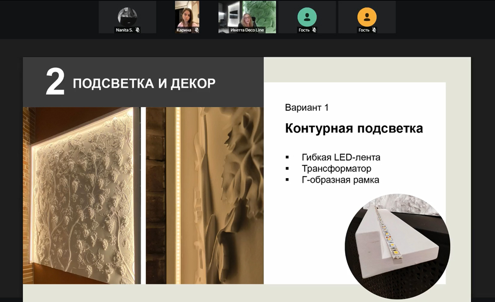 Backlighting was a particularly interesting topic for discussion. Without a doubt, properly designed lighting for a wall panel guarantees 50% of the effect. It's no coincidence that almost all product renderings presented on our website feature backlighting. During the online meeting, we detailed and demonstrated examples of various installation methods for accent wall lighting: contour lighting, niches with light profiles, and spotlights.