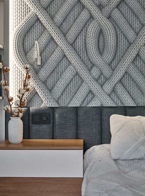The children's bedroom features a solution using the ARAN plaster bas-relief, made using a technique reminiscent of the texture of knitted fabric. This wall has become a real art object, emphasizing attention to detail and creating a warm, homely atmosphere. The lighting integrated into the structure accentuates the volume and complex structure, making the space visually deeper and more expressive. This is not only a designer, but also an environmentally friendly interior solution for health.