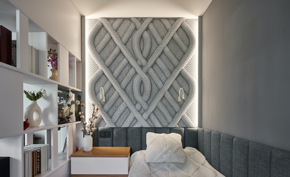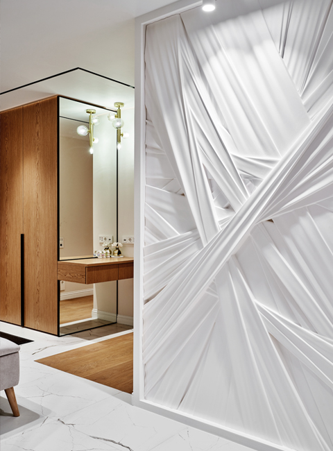 Нередко возникает необходимость зрительно увеличить комнату или скорректировать пропорции помещения. Направленная подсветка верхней части объемного панно или контурная подсветка вдоль его верхнего края расширит границы помещения, сделает потолки визуально выше и просторнее. Такой метод широко применяется дизайнерами при создании иллюзии дополнительного объема пространства, что особенно актуально для небольших квартир и студий.